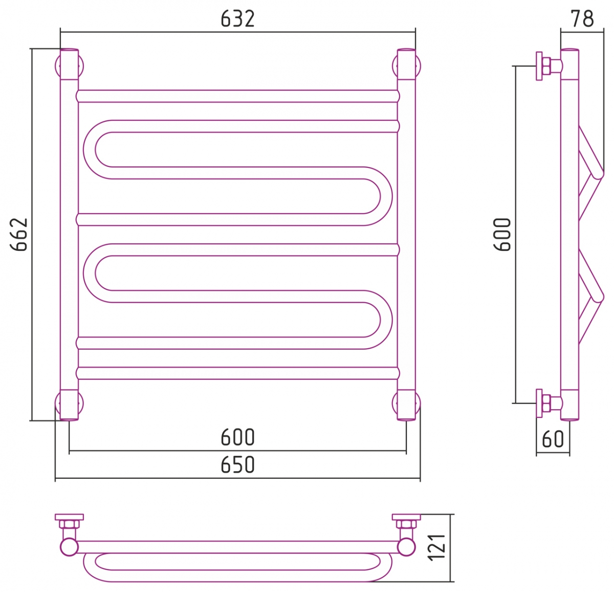Необычный внешний водяного полотенцесушителя Сунержа, модельного ряда Элегия, с габаритами 600 мм в высоту и 600 мм в ширину, отлично впишется в интерьер вашей квартиры, и в особенности, вашей ванной комнаты.